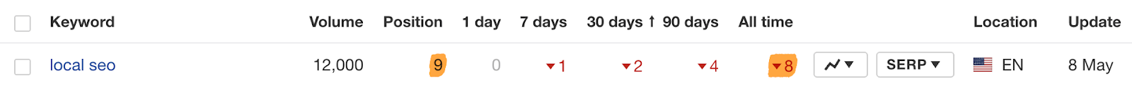 Zum Beispiel ist unsere Ranking-Position für “Lokale SEO” von Platz 1 auf Platz 9 gefallen, seit wir mit dem Tracking des Keywords begonnen haben.