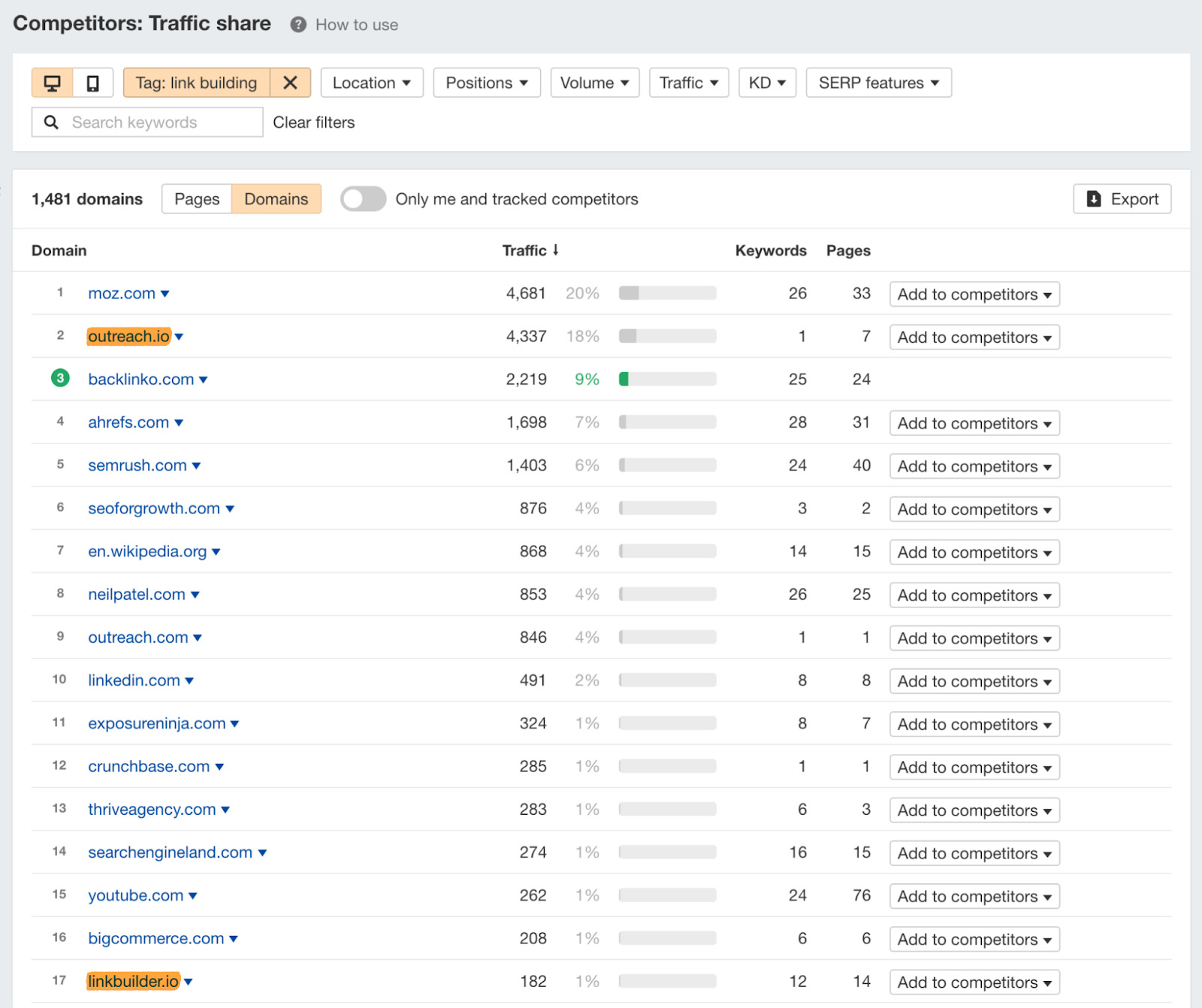 Wenn wir zum Beispiel nach unserem “Linkaufbau”-Tag filtern, sehen wir ein paar Konkurrenten, die vorher nicht aufgetaucht sind, wie outreach.io und linkbuilder.io.
