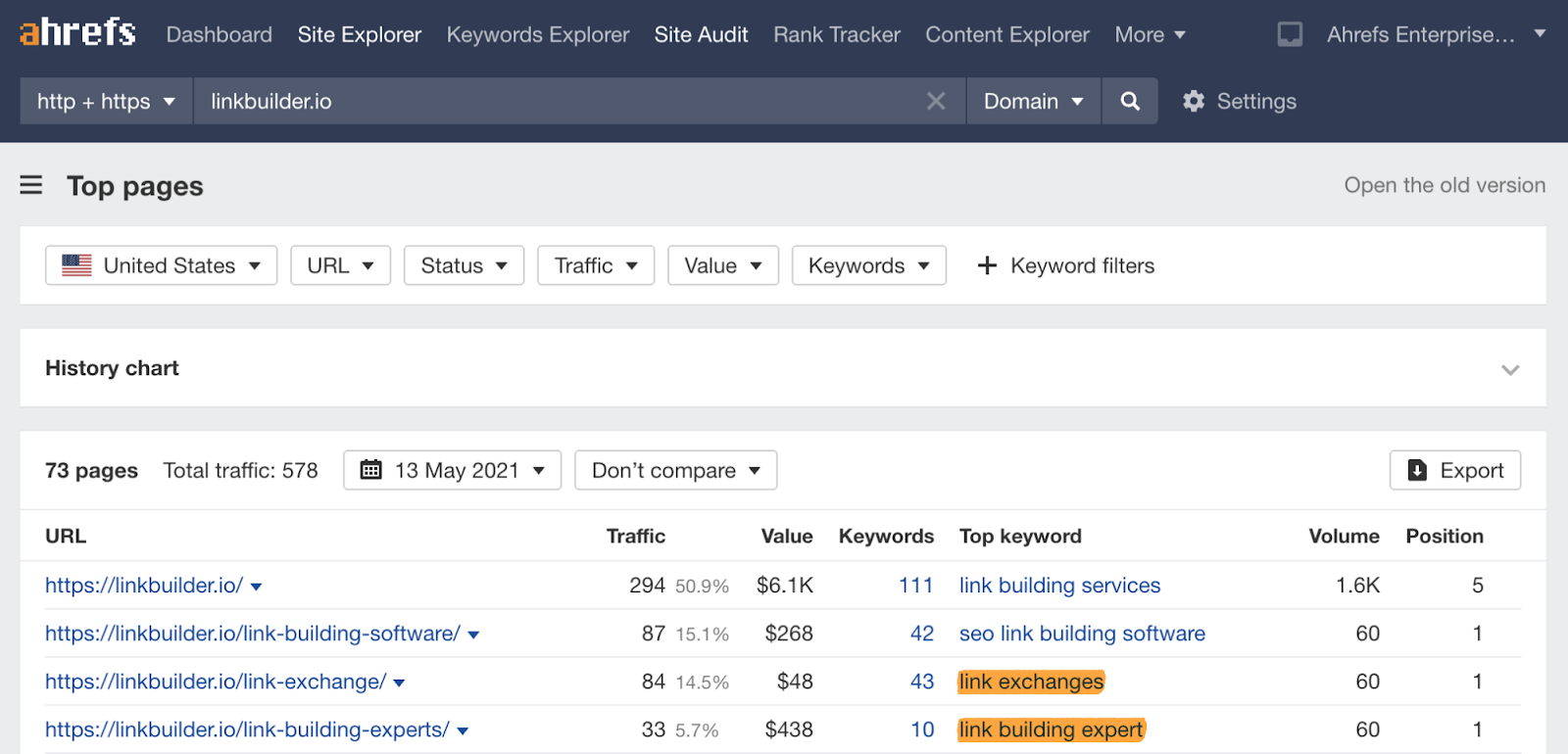 Da wir immer auf der Suche nach weiteren Linkaufbau-Themen sind, lohnt es sich wahrscheinlich auch, den Top-Seiten-Bericht für diese Websites im Site Explorer zu überprüfen.