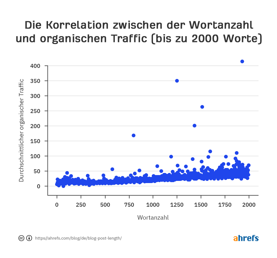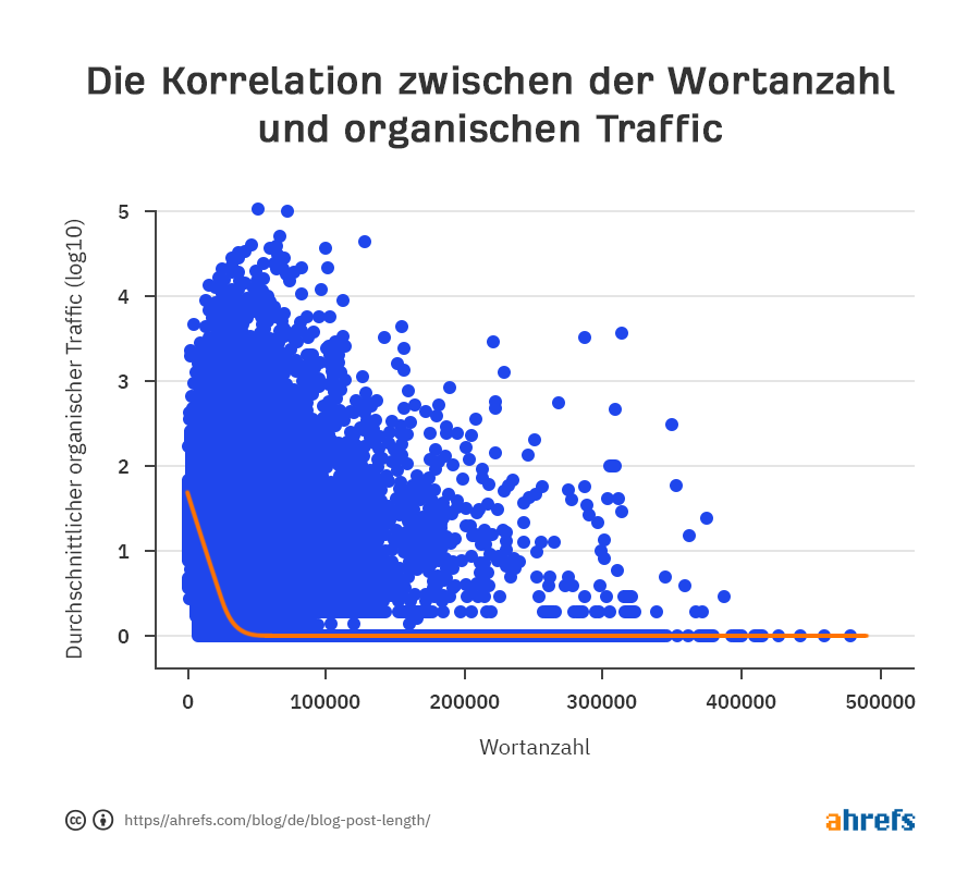 Unserer Analyse der Seiten im Content Explorer zufolge gibt es eine mäßig positive Korrelation zwischen der Länge der Inhalte und dem organischen Traffic.