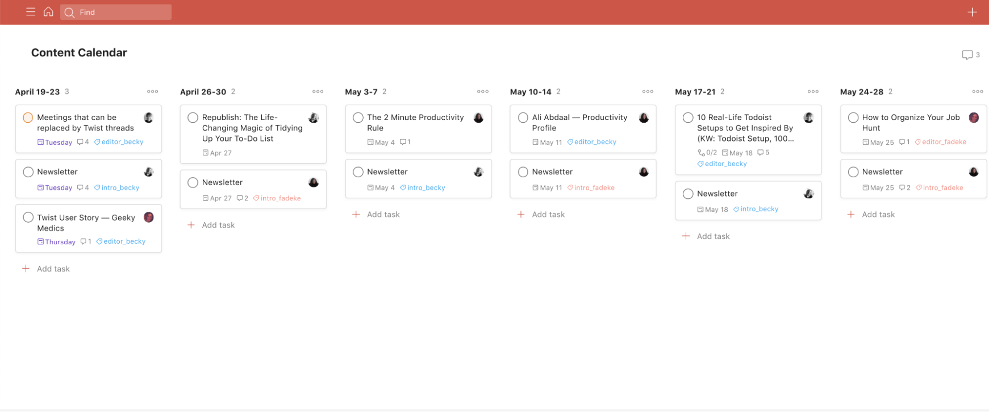 Fadeke Adegbuiy bei Doist nutzt ebenfalls ein Kanban-Board in Todoist, um den Kalender ihres Teams in wöchentliche Sprints aufzuteilen. Jeder im Team hat Zugriff auf das Board und kann die Blogposts und Newsletter in der Posting-Pipeline sehen; sie nutzen oft Kommentare auf einer einzelnen Karte, um hilfreiche Ressourcen oder Inspirationen für den Verfasser zu liefern, der einem Beitrag zugewiesen ist. Du könntest einen ähnlichen Board-ähnlichen Ansatz verwenden, wenn du einen Überblick darüber haben willst, was in einer bestimmten Woche passiert und überprüfen willst, ob alle auf Kurs sind.