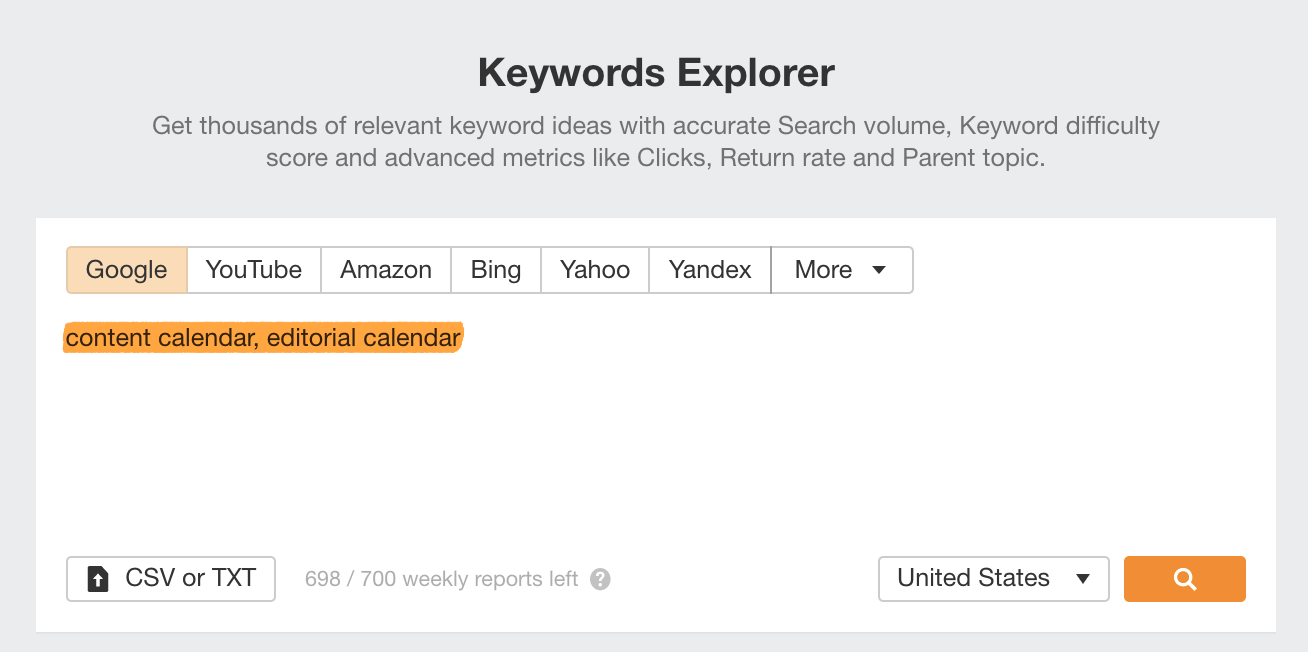 - Wir nutzen den Keywords Explorer von Ahrefs, um eine Keyword-Recherche durchzuführen und Themen zu identifizieren, die wir gerne abdecken möchten: