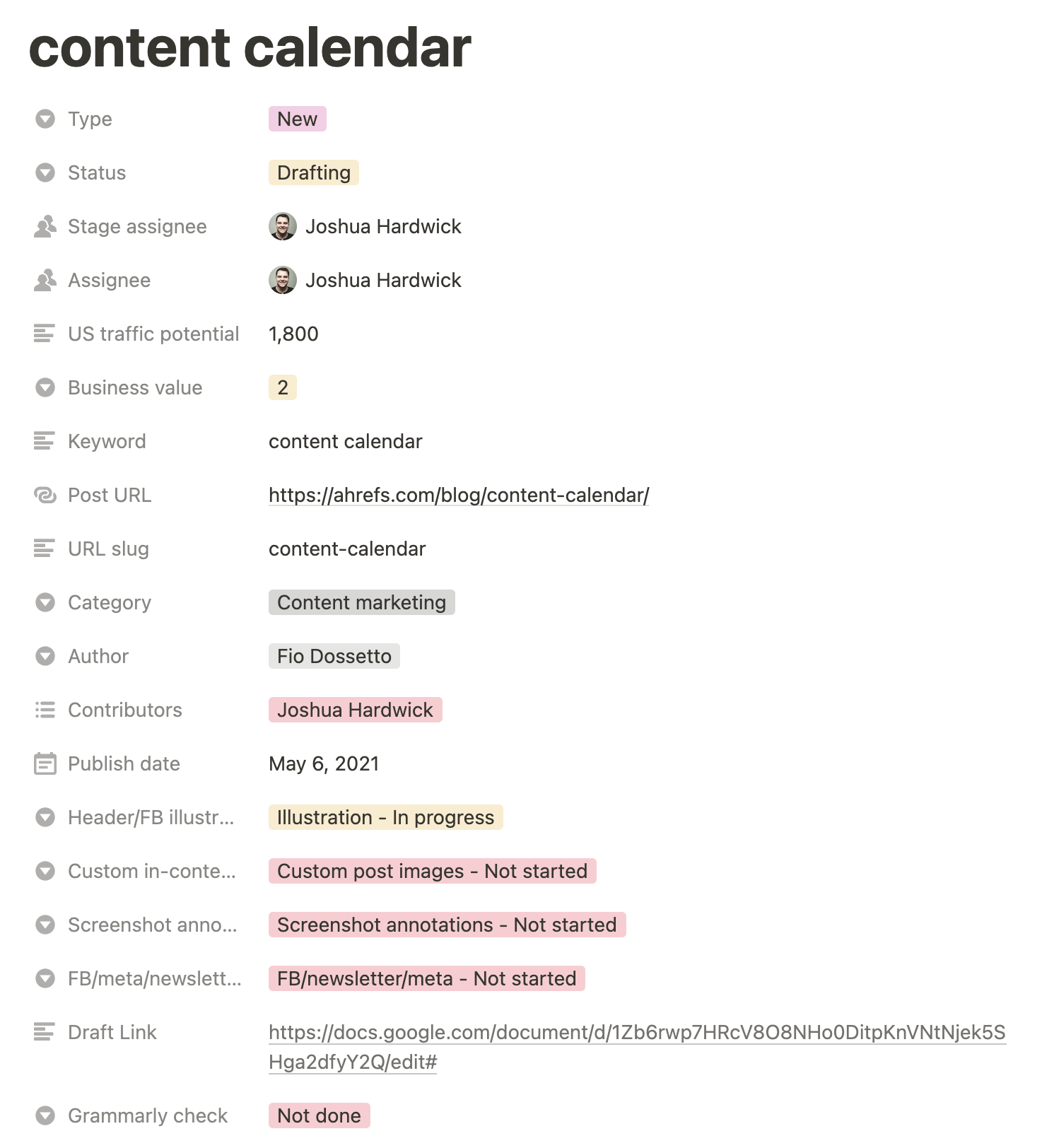 - Wir fügen die Themen, die unsere Keyword-getriebene, produktorientierte Strategie vorantreiben werden, in ein Spreadsheet ein. Erst wenn jemand anfängt, aktiv an einem Beitrag zu arbeiten, fügen wir ihn auch zu unserem Kalender hinzu.