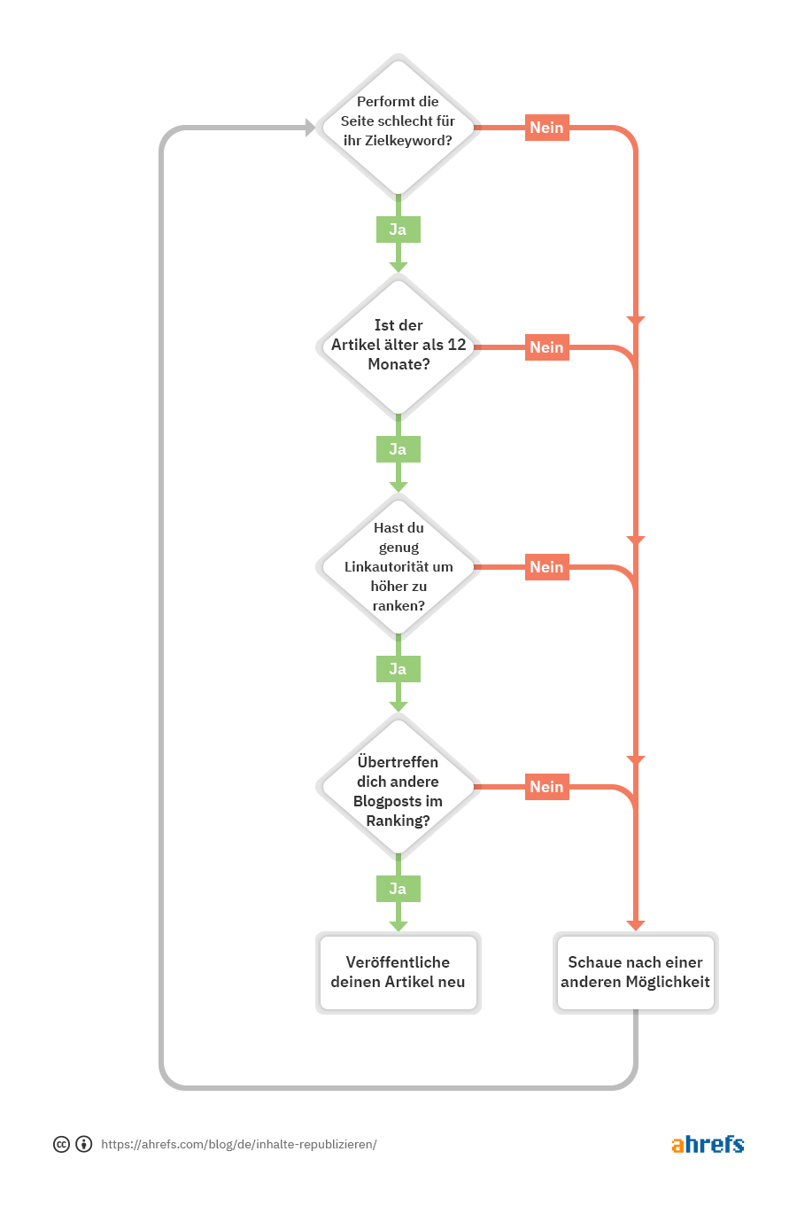 Musst du alles aktualisieren? Nein, vor allem, wenn du wie wir Hunderte von Blogbeiträgen hast. Stattdessen musst du Prioritäten setzen. Dazu folgst du diesem Flussdiagramm: