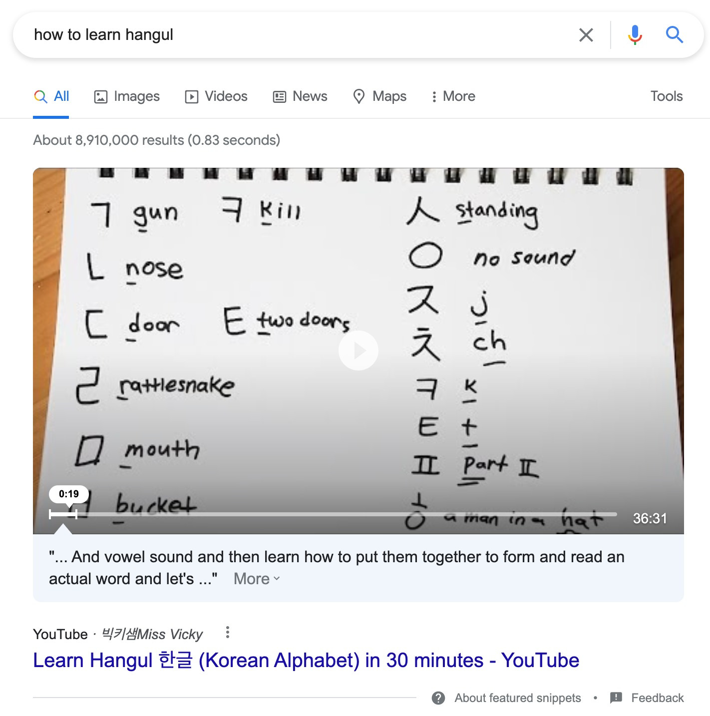 Content-Typen lassen sich in der Regel in eine von fünf Kategorien einteilen: Blogpost, Produkt, Kategorie, Landing Page oder Video. Wenn wir zum Beispiel nach “Wie lerne ich Hangul” suchen, sehen wir, dass die ersten paar Ergebnisse hauptsächlich Videos sind.