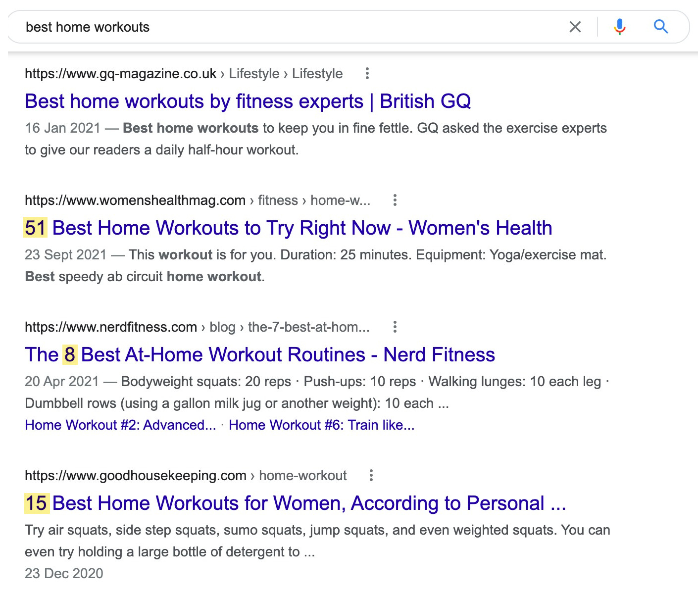 Zum Beispiel sind die am besten rankenden Ergebnisse für “bestes Heimtraining” meist Listen-Artikel: