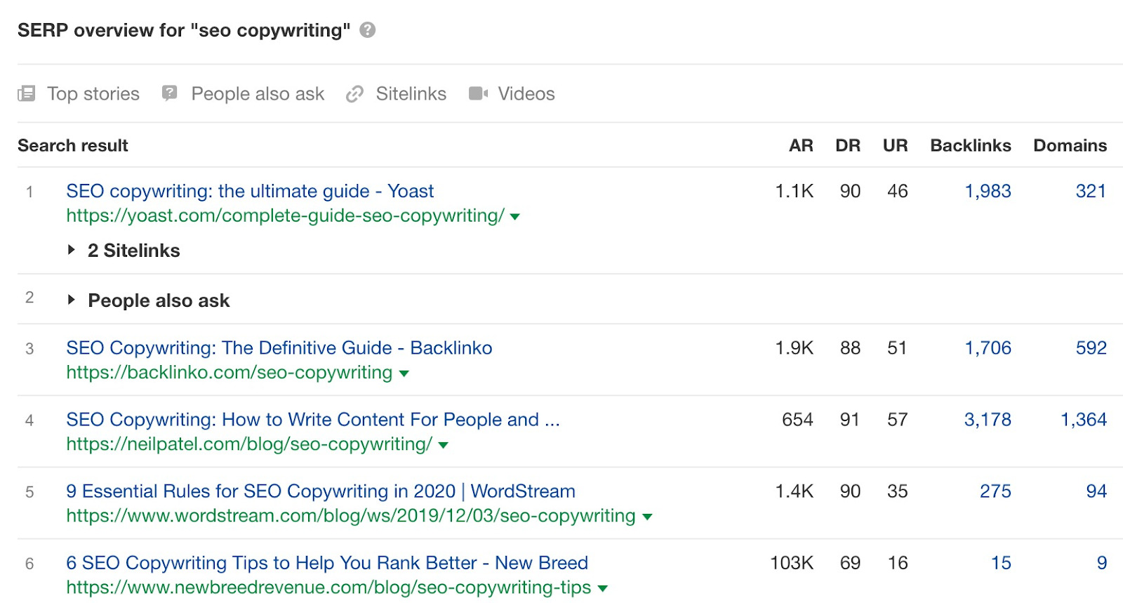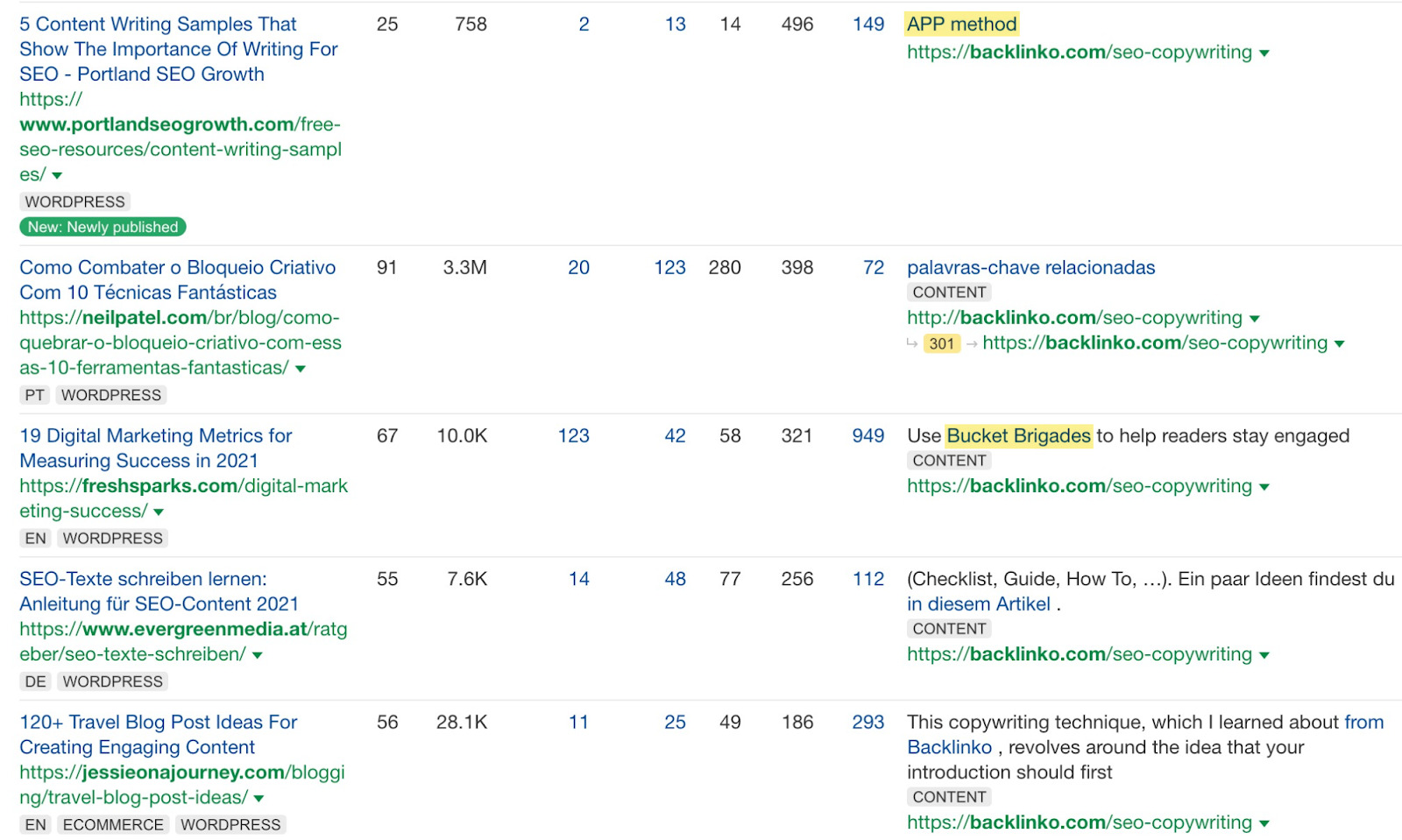 Wenn wir das zum Beispiel für den Beitrag von Backlinko (alias Brian Dean) über SEO-Texte machen, sehen wir, dass ziemlich viele Leute wegen einiger einzigartiger Tipps verlinken, die Brian über die APP-Methode, Bucket Brigade usw. geschrieben hat.