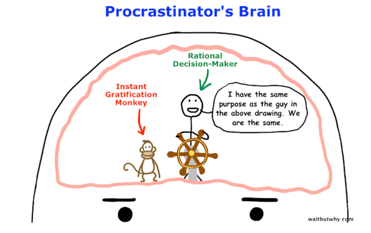 Anstelle eines Selbsthilfe-Tirade über die Gefahren der Prokrastination, entschied er sich zu erklären, warum es passiert, mit Hilfe von niedlichen Illustrationen: dem Instant Gratification Monkey, Panic Monster, etc.