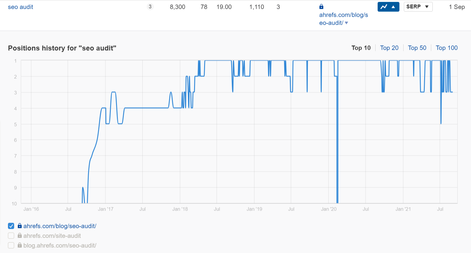 Unsere historischen Rankings für “SEO-Audit” über den Ahrefs Site Explorer.