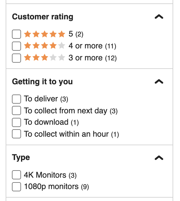 Sehen wir uns die E‑Commerce-Website currys.co.uk als ein Beispiel dafür an. Wir beginnen auf der Seite mit den HP PC-Monitoren. Es handelt sich um ein Standard-E-Commerce-Layout mit einem Header, Listen und einer facettierten Suche über dem Fold: