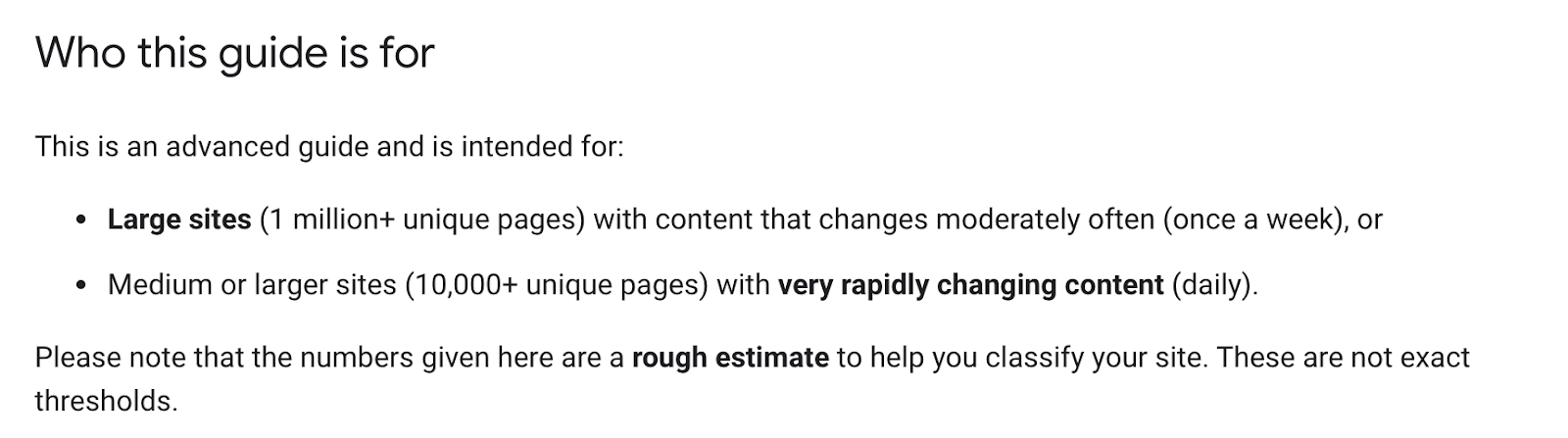 Die Verwaltung des Crawl-Budgets hat für Google keine Priorität, es sei denn, du hast eine große Website (mehr als 1 Mio. Seiten) oder eine mittelgroße Website (mehr als 10.000 Seiten) mit sehr schnell wechselnden Inhalten.