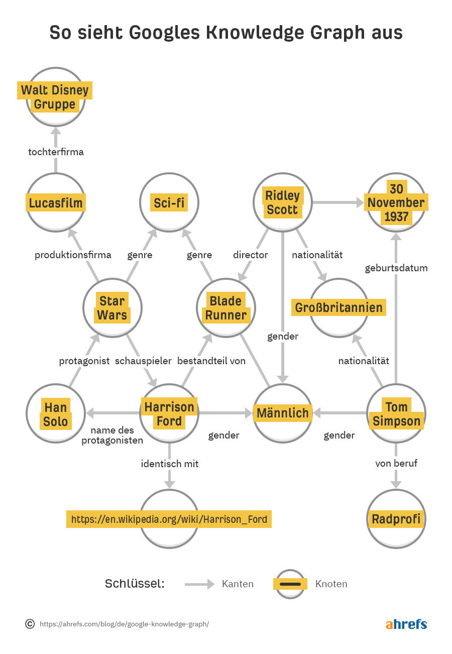 Googles Knowledge Graph ist eine Informationsdatenbank bestehend aus Einträgen und den Beziehungen zwischen diesen Einheiten.