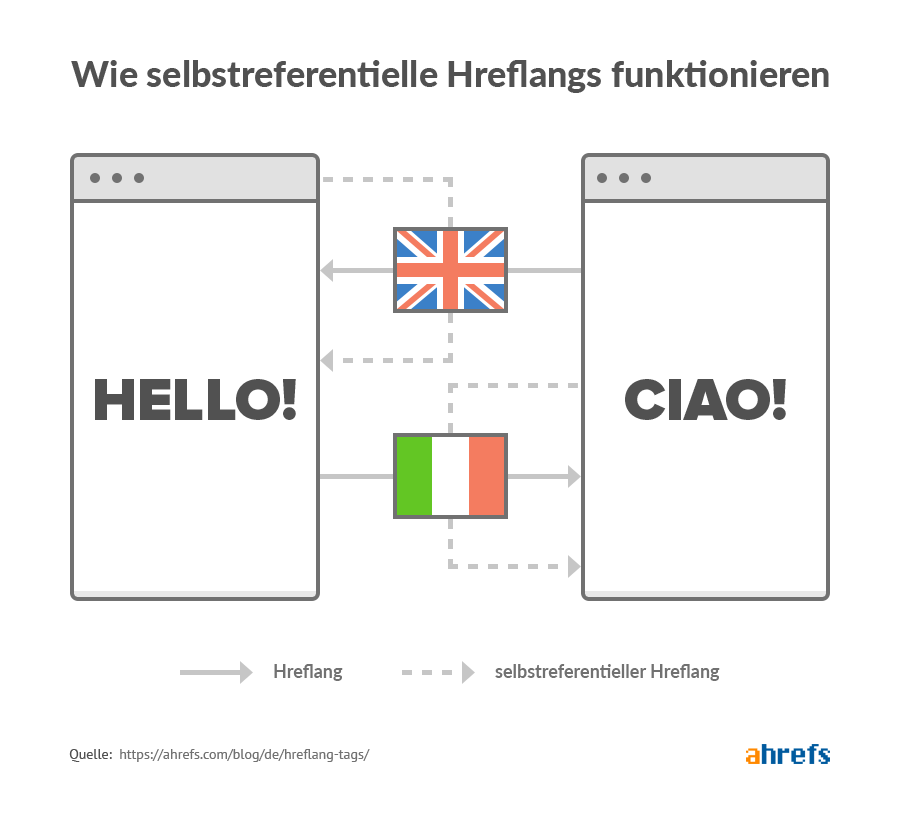 Wenn wir also hreflang-Tags zwischen einer englischen Seite (https://example.com/hello) und einer italienischen Seite (https://example.com/ciao) hinzufügen wollen, dann sollten beide jeweils folgende hreflang-Tags haben: