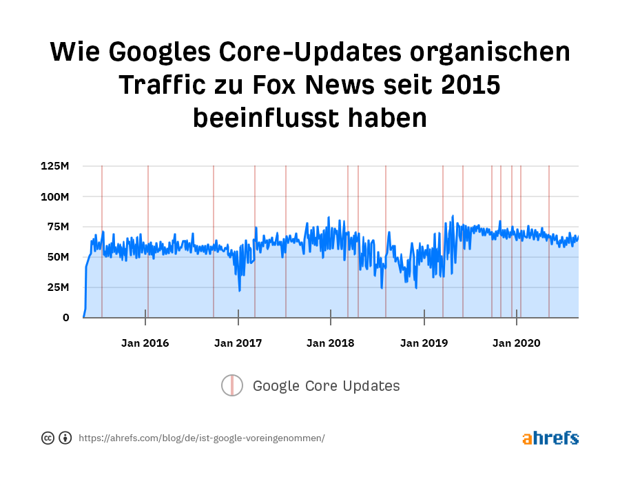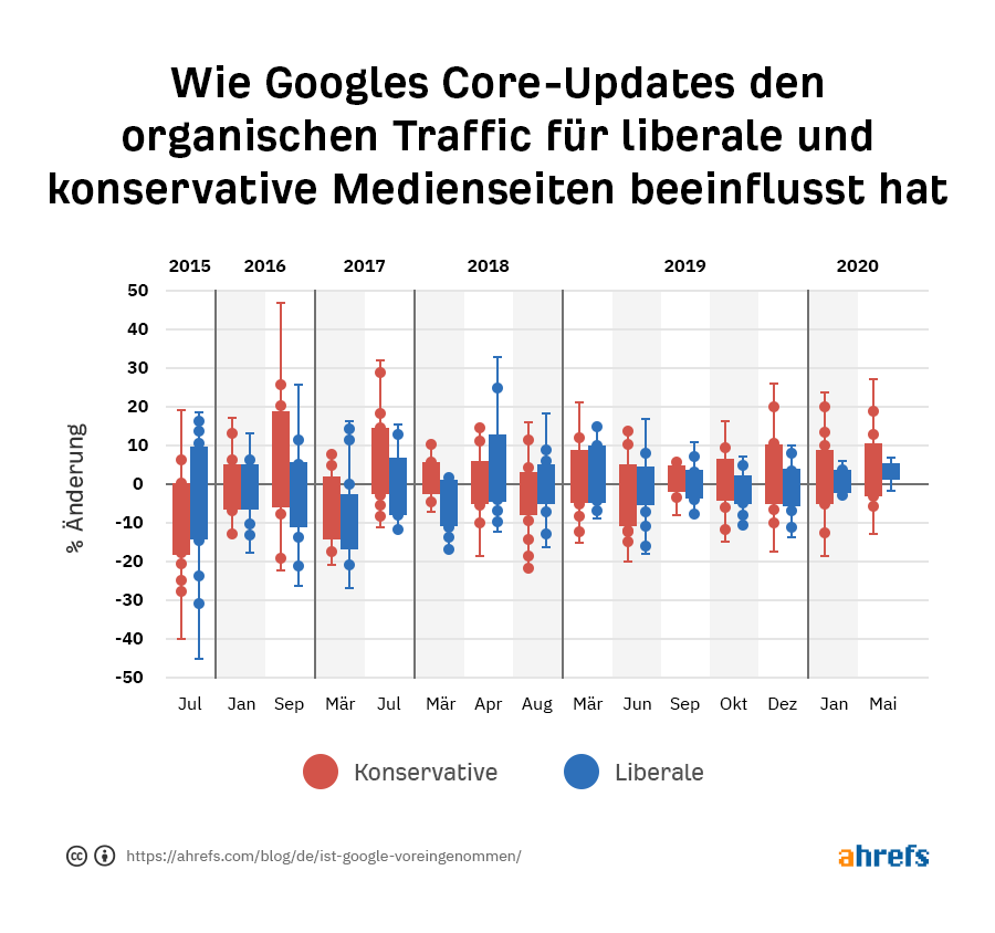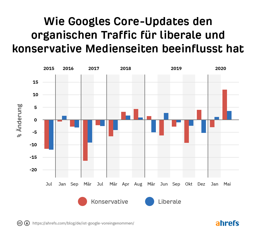 Eine grundsätzliche Voreingenommenheit existiert immer. Während unsere Daten aufzeigen, dass Googles Core-Updates in den letzten Jahren im Hinblick auf keine bestimmte Seite voreingenommen war, können wir eine Voreingenommenheit in anderen Bereichen von Googles Systemen nicht mit Sicherheit ausschliessen.