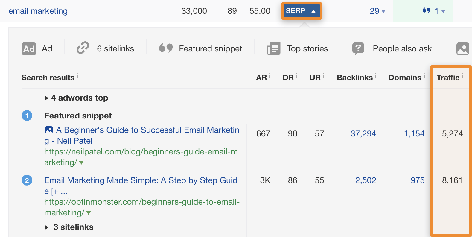 Um das im Content Gap Tool zu tun, klicke einfach auf den SERP-Button und überprüfe die Traffic-Spalte.