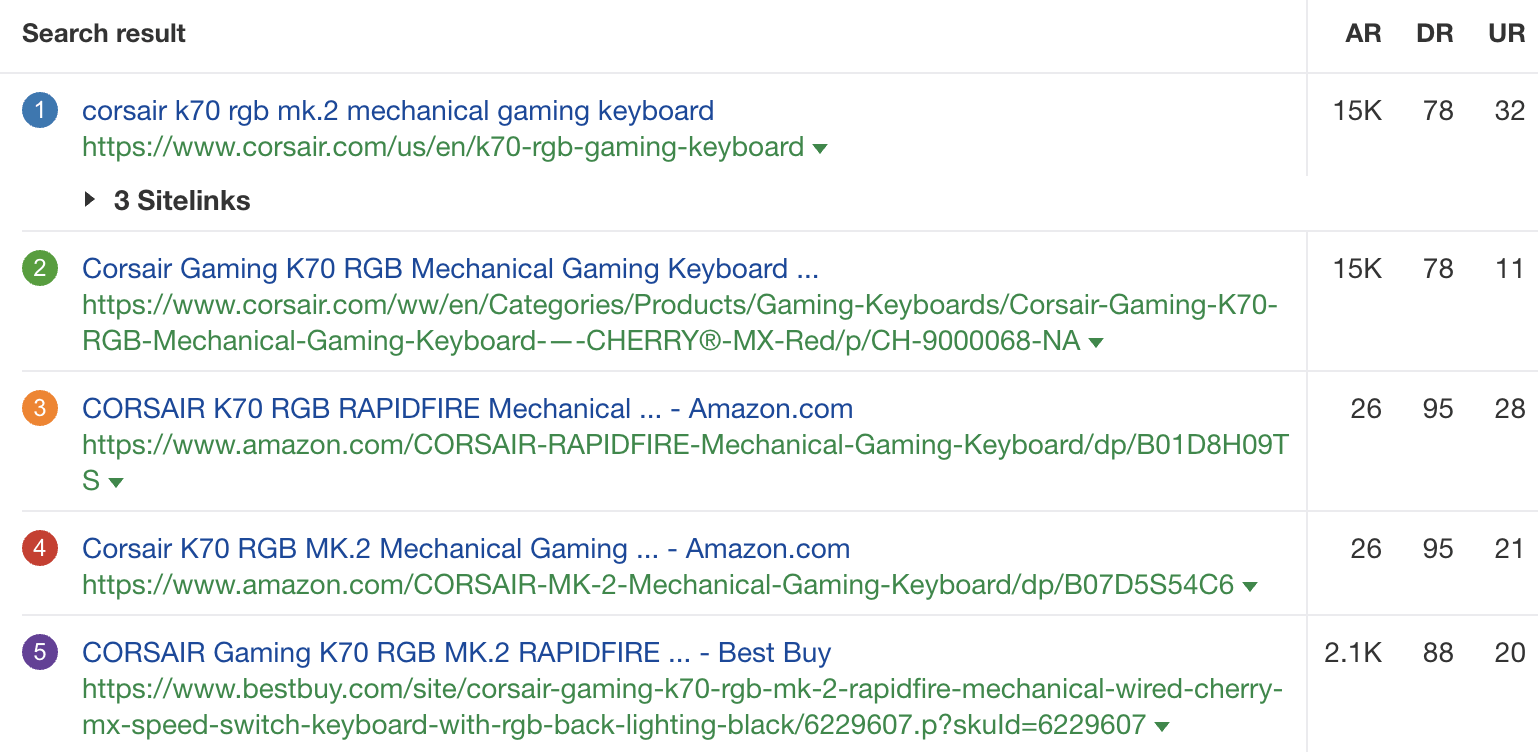 Denke daran, dass es wenig Sinn macht, ein Keyword zu verwenden, wenn du nicht die Art von Content veröffentlichst, die mit der Suchintention übereinstimmt. Wenn du zum Beispiel einen EDV-Blog betreibst, macht es wenig Sinn, ein Keyword wie “corsair k70” zu verwenden, da sich die Suchenden hierfür im Kaufmodus befinden. Dieser Intention kann man ohne eine Produktseite nicht gerecht werden, und die wird es bei einem Blog nicht geben.