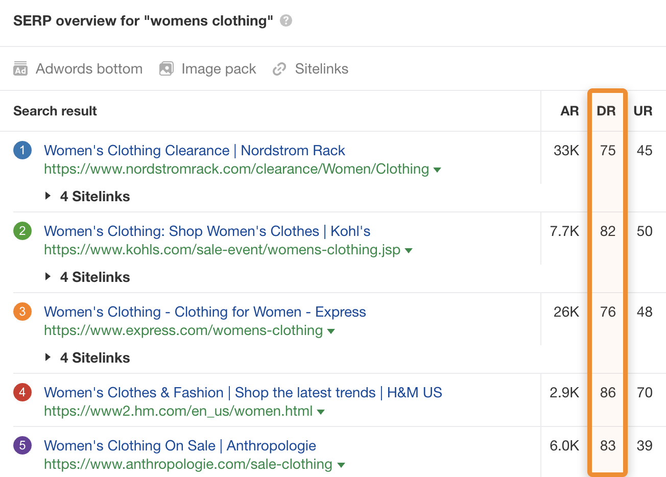 Bei Ahrefs haben wir eine Metrik namens Domain Rating (DR), die die Autorität einer Website basierend auf der Stärke ihres Backlink-Profils darstellt. Dies fließt nicht in unseren KD-Score ein, aber als allgemeine Regel gilt, dass es schwierig sein kann, zu ranken, wenn die Top-Ergebnisse für ein Keyword von Websites mit weitaus höheren DR-Scores kommen als deine.
