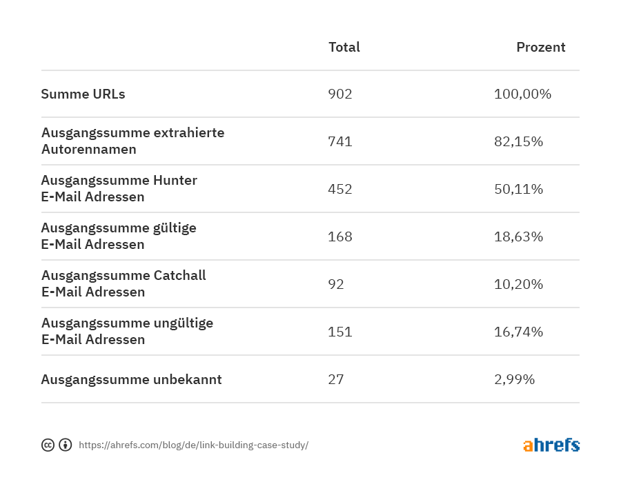 Basierend auf den zustellbaren E‑Mails ergibt sich für uns eine Konversionsrate von 5,71%, was bedeutet, dass 27 der kontaktierten Betreiber auf uns verlinkt haben.