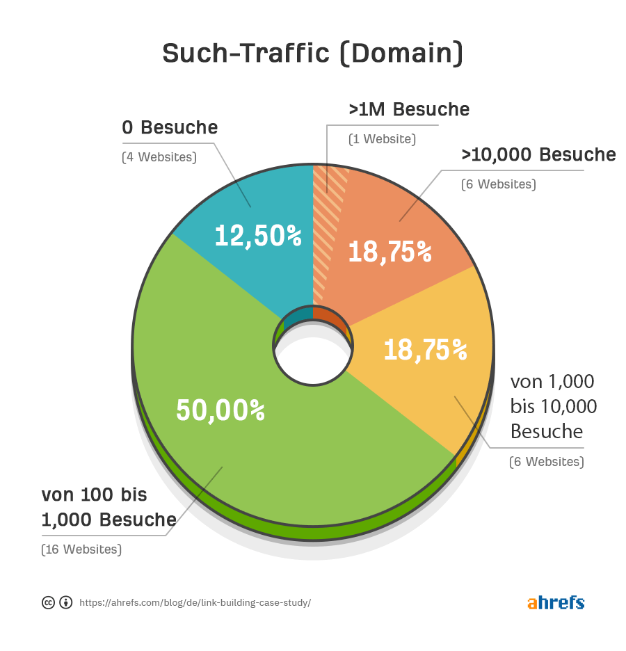 Eine Website erhält mehr als 1.000.000 monatliche Such-Visits. 6 erhalten zwischen 10.000 und 1.000.000. 6 erhalten zwischen 1.000 und 9.999. 16 erhalten zwischen 100 und 999. Und 4 erhalten keinen Traffic.
