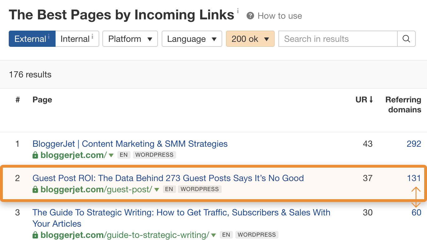 Jetzt musst du nur noch die Blogs überprüfen, auf denen sie sich befinden, und deine Chancen abschätzen, dort veröffentlicht zu werden. Wenn dir die Blogs zu schwach oder zu stark erscheinen, kannst du den DR-Filter jederzeit anpassen, bis du den idealen Wert an Blog-“Autorität” gefunden hast, bei dem du dich wohl fühlst.