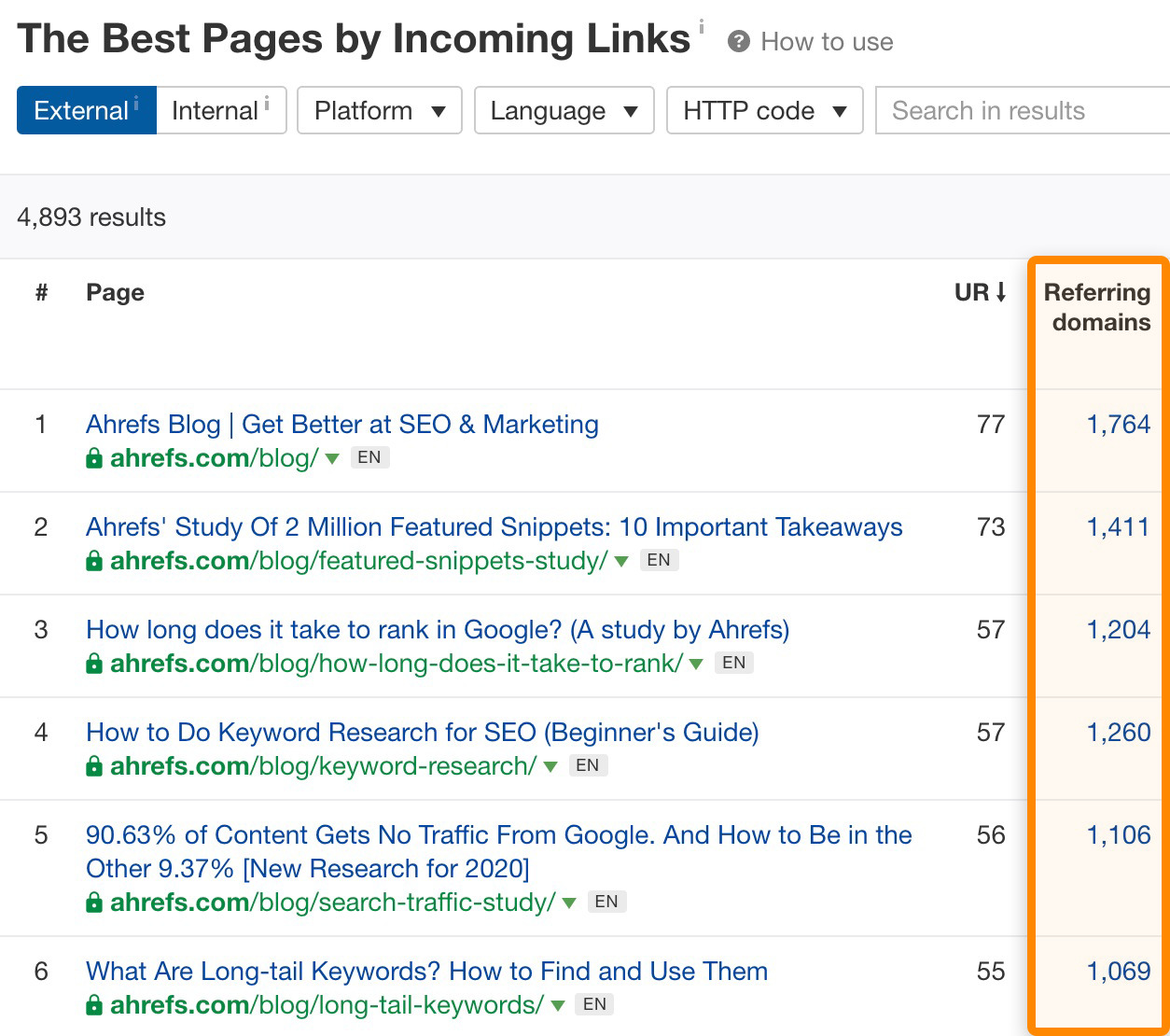 Suche in den Titeln der Seiten einfach nach einem Thema, über das du schreiben möchtest, und sortiere die Ergebnisse nach verweisenden Domains (verlinkenden Websites). Eine Untersuchung dieser Seiten und ihrer Links sollte dir eine Menge Ideen liefern, wie du deinen eigenen Content besser machen kannst.