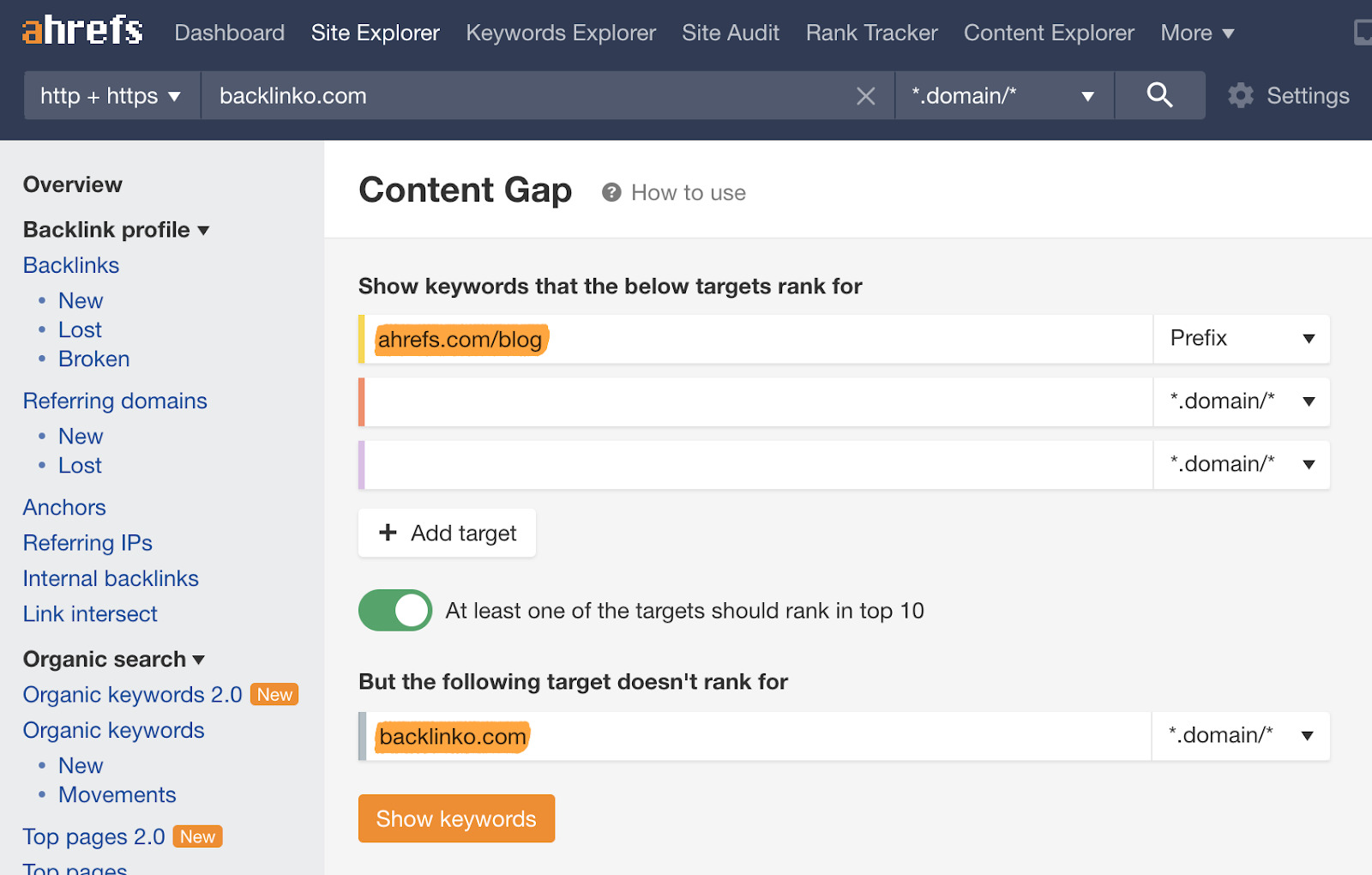Hier bei Ahrefs haben wir ein praktisches Tool, das dir hilft, Content-Lücken zwischen Websites zu finden. Es hat einen sehr treffenden Namen: Content Gap.