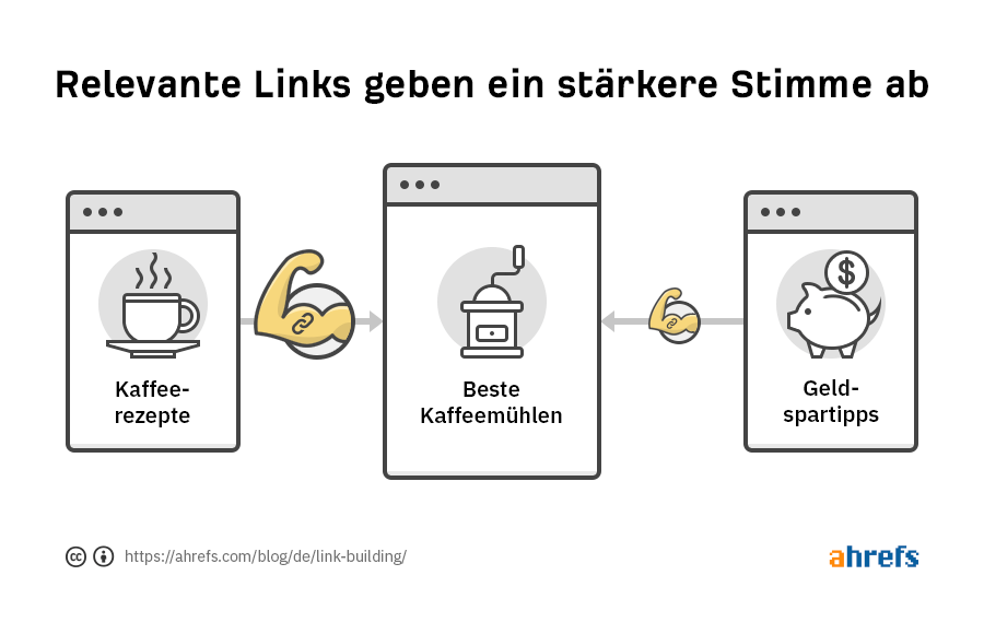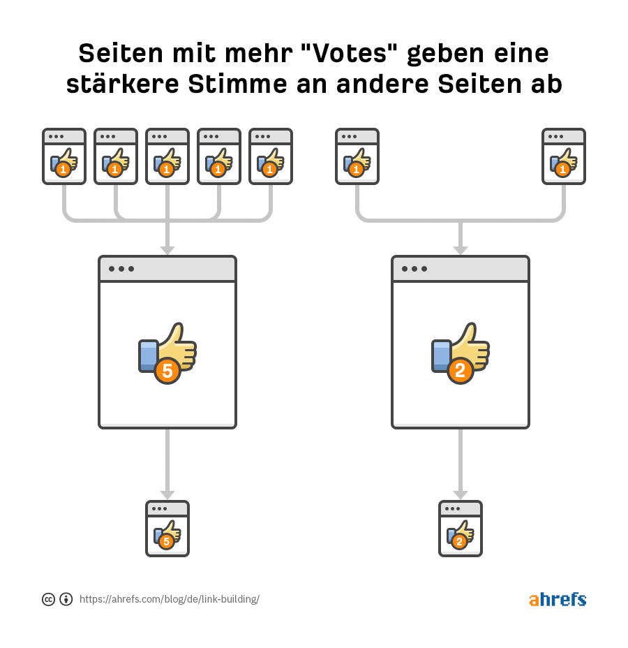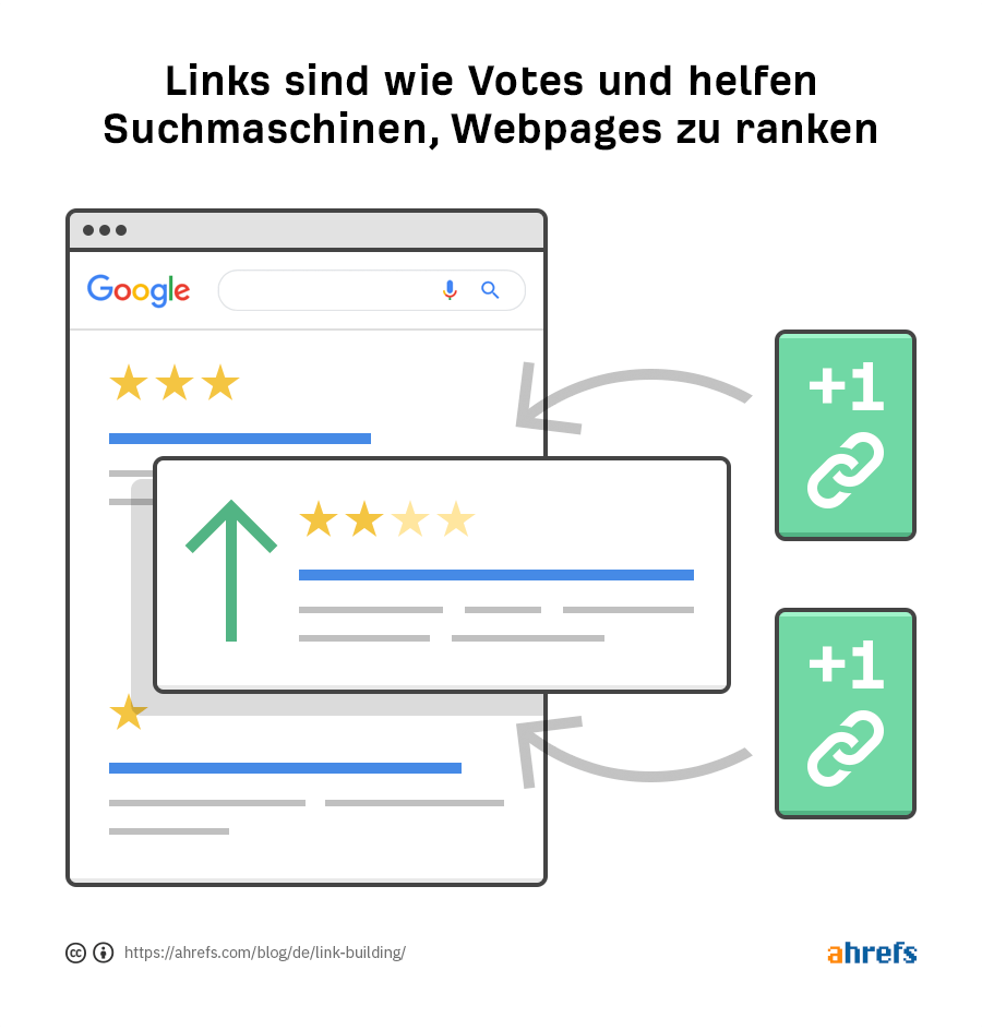 Google (und andere Suchmaschinen) sehen Links von anderen Seiten als “Votes” (“Stimmen”) an. Diese Votes helfen ihnen zu erkennen, welche Seite zu einem bestimmten Thema (unter Tausenden von ähnlichen) es verdient, ganz oben in den Suchergebnissen zu stehen.