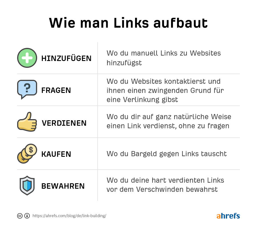 Konzeptionell gesehen, lassen sich die meisten Linkaufbau-Methoden und ‑Strategien in einen der folgenden fünf Bereiche einordnen: Hinzufügen, Fragen, Kaufen, Verdienen und Bewahren.