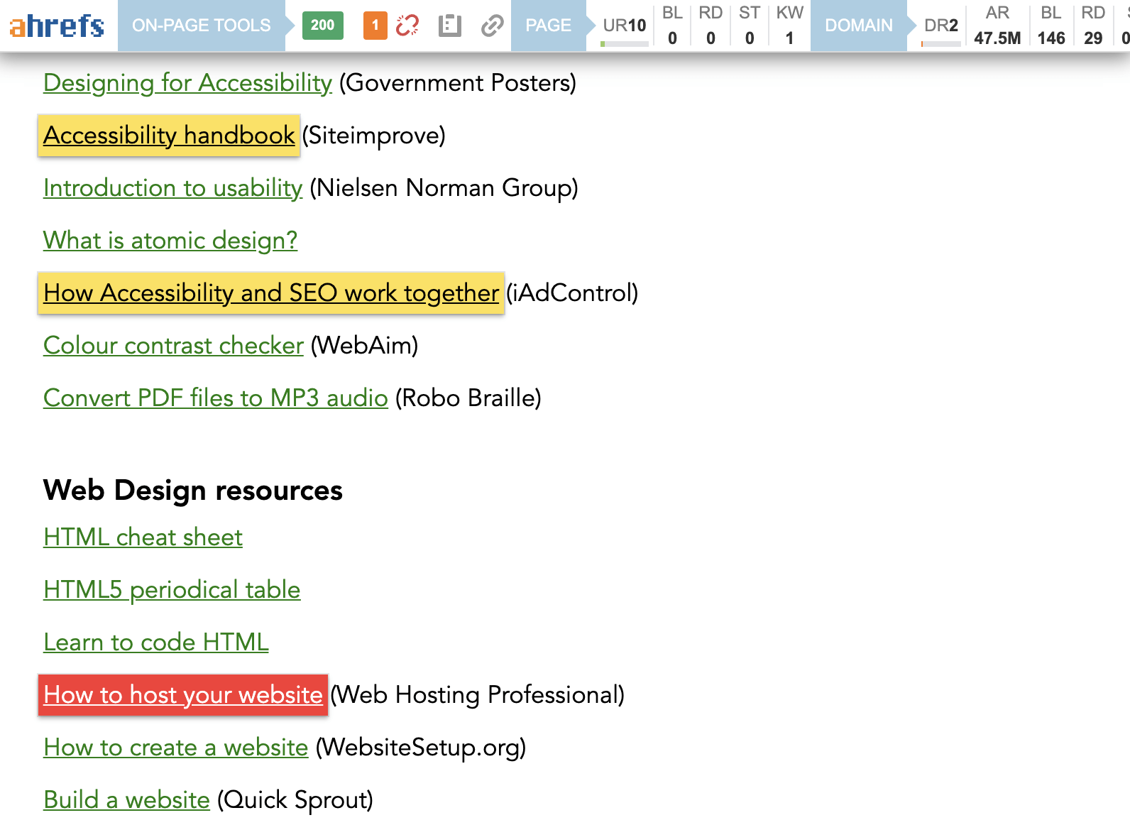 Nehmen wir zum Beispiel an, dass wir diese Ressourcenseite auf unserer Liste potenzieller Linkmöglichkeiten haben. Mit der SEO Toolbar von Ahrefs können wir interne und tote Links mit wenigen Klicks hervorheben: