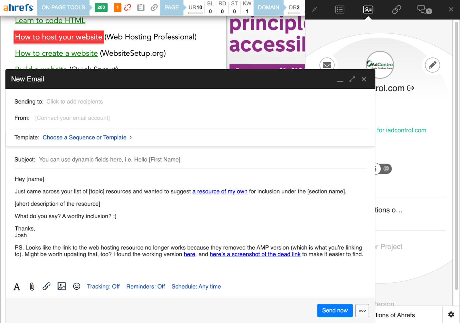 Jetzt können wir sehen, dass die Seite auf viele externe Ressourcen verweist (da die meisten Links nicht hervorgehoben sind) und mindestens einen toten Link enthält. So kannst du schnell und einfach gute potenzielle Kunden ausfindig machen und relevante, personalisierte Kontaktmails wie diese erstellen:
