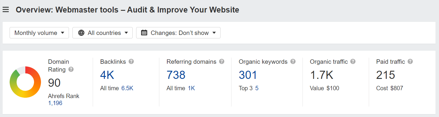 Wenn wir von der organischen Suche ausgehen, sehen wir, dass die Landing Page der Ahrefs Webmaster Tools schätzungsweise 17.000 organische Suchanfragen erhält. Das ist passiver, fast kostenloser Traffic ohne zusätzliche Werbung.