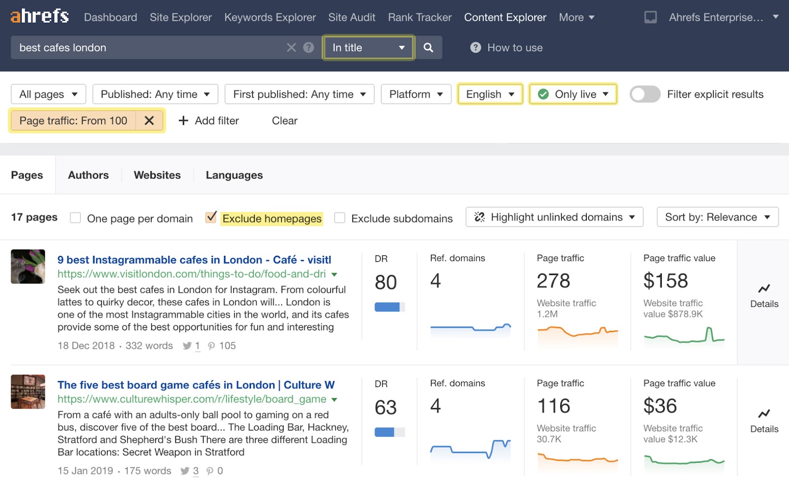 Du kannst relevante Listen mit Traffic mit dem Content Explorer von Ahrefs finden:
