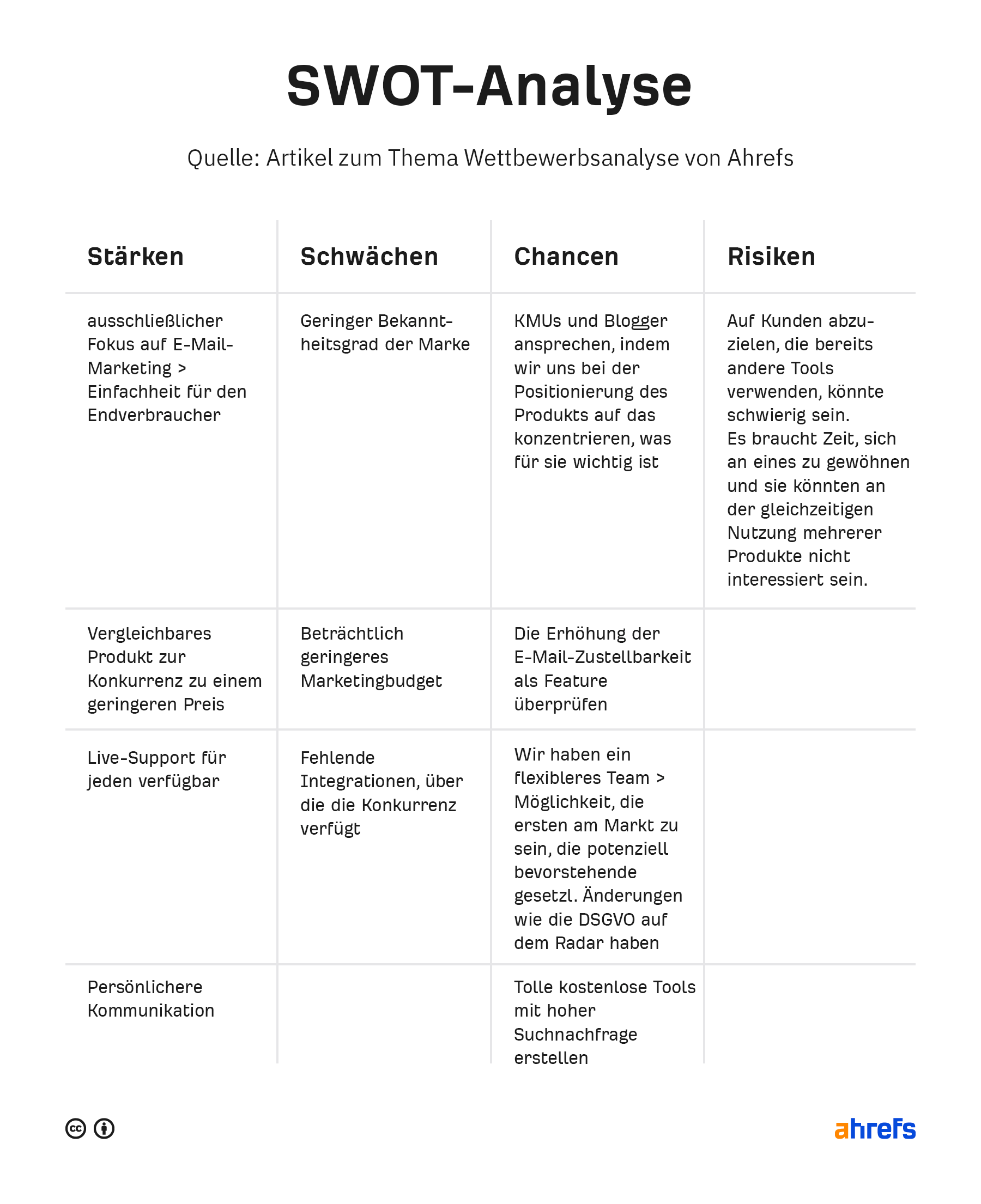 Hier ist ein Mockup des Ergebnisses der SWOT-Analyse für einen fiktiven E‑Mail-Marketing-Dienstleister: