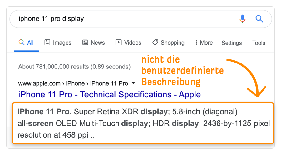 Das geschieht, weil die hartkodierte Beschreibung für die “Long-Tail”-Keywords weniger relevant ist. Für Google ist es sinnvoller, ein eigenes Snippet zu verwenden.