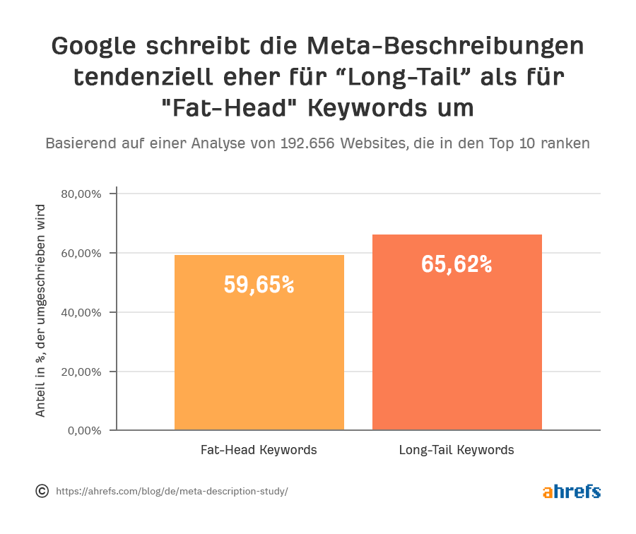 Zwar schreibt Google die Meta-Beschreibungen tendenziell eher für “Long-Tail”-Keywords um, aber nur in geringem Ausmaß.