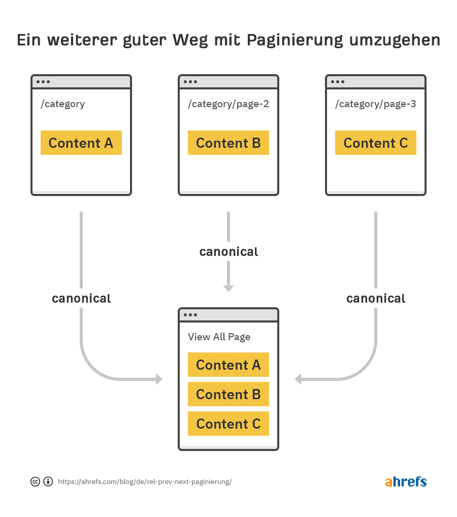 Du kannst auch paginierte Seiten kanonisieren, so dass sie auf eine Seite zeigen, die den gesamten Inhalt anzeigt. Auf diese Weise kann der Inhalt immer noch in Seiten für Benutzer aufgeteilt werden, aber die indizierte Version wird den gesamten Inhalt enthalten.