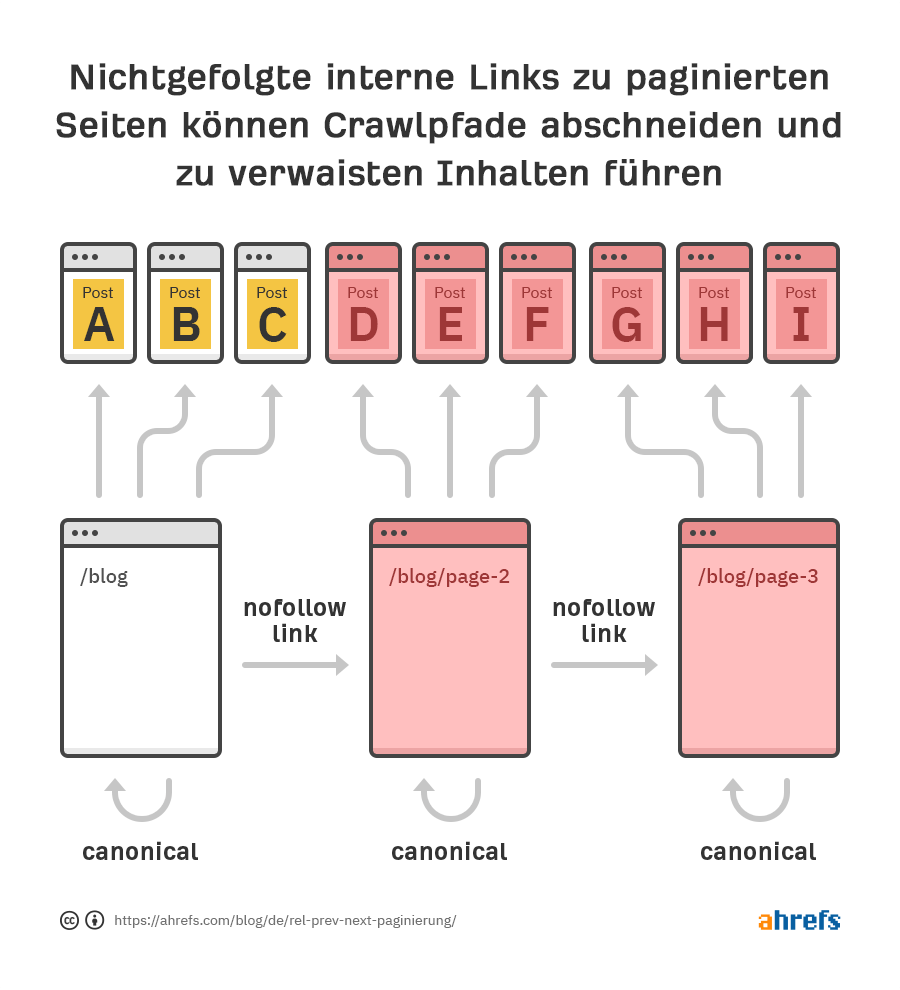 Interne Links zu anderen paginierten Seiten sollten niemals als nofollow gekennzeichnet werden. Nofollow ist jetzt ein Hinweis für Google, und dein bester Fall ist, dass sie ignorieren, was du als nofollow markierst. Was passiert, ist, dass du das Crawlen und Weiterleiten von Signalen wie dem PageRank durch deine Website unterbinden könntest, und wiederum können Seiten verwaisen.