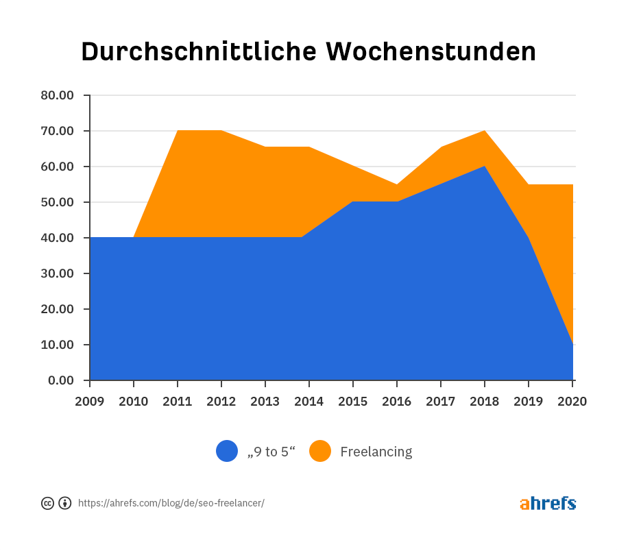 Ich habe alle diese Vorteile persönlich erfahren, aber die verbesserte Work-Life-Balance ist für mich wohl der wichtigste Vorteil. Unten siehst du, dass sich meine Gesamtstundenzahl seit dem Wechsel zur Vollzeit-Freiberuflichkeit tatsächlich verringert hat. Das liegt daran, dass alle meine freiberuflichen Stunden abrechenbar sind und nicht wie in meinem alten “9–5”-Job in einem Meeting nach dem anderen vergeudet werden.