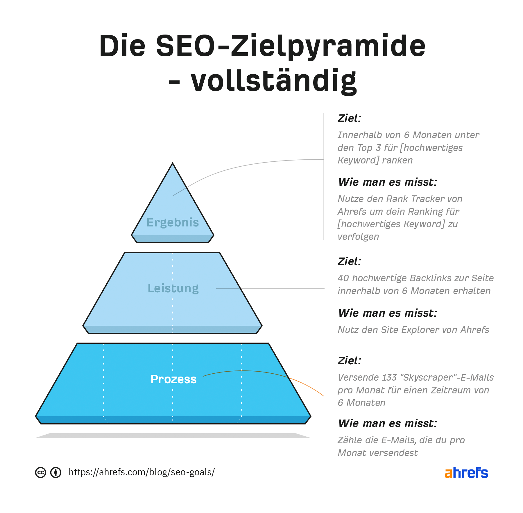 Du kannst dir deine SEO-Ziele wie eine Pyramide vorstellen, mit dem Ergebnis an der Spitze und kleineren Zielen, die auf niedrigeren Ebenen dorthin führen. Die Idee ist, dass du unten anfängst und dich nach oben arbeitest.