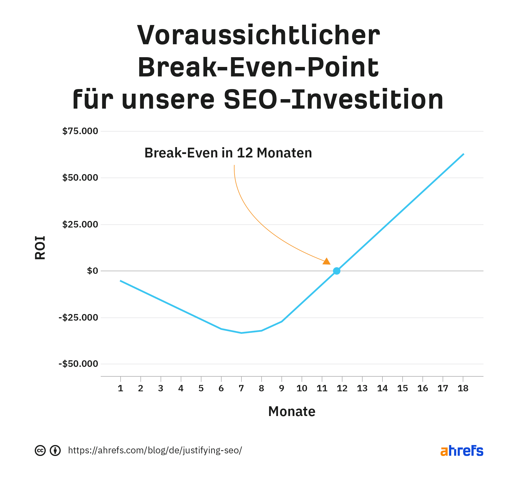 Aus diesem Grund ist es sinnvoller, ein “Break-even”-Diagramm zu erstellen. Dieses zeigt, wie lange es dauert, bis sich die Investition in SEO amortisiert hat.