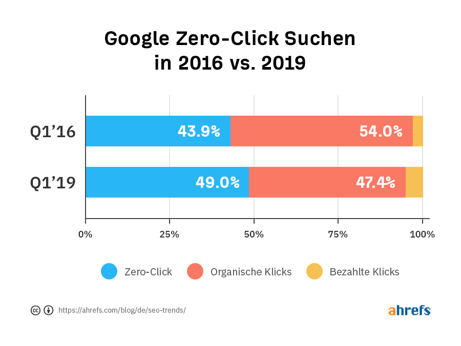 Zwischen 2016 und 2019 stieg die Anzahl der Null-Klick-Suchen von 43,9% auf 49%.