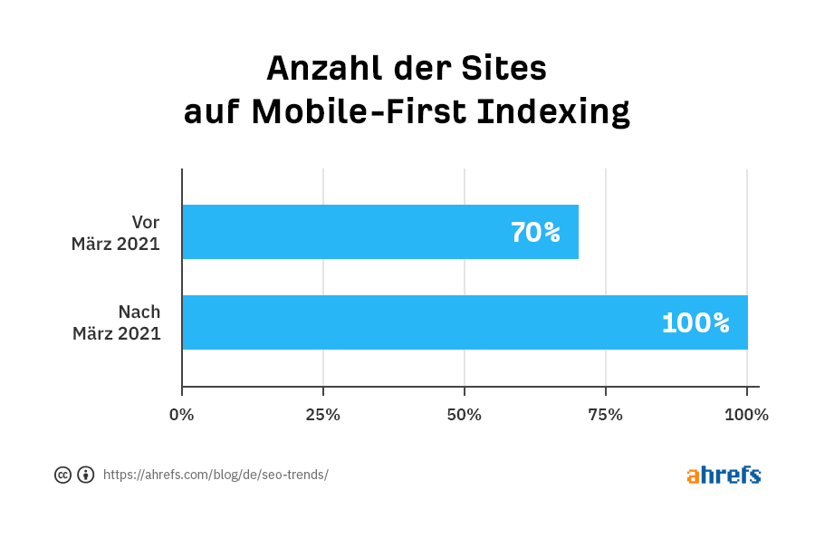 Google definiert die Mobile-First-Indexierung so, dass es “die mobile Version des Inhalts für die Indexierung und das Ranking verwendet”. Im Moment sind bereits 70% der Websites auf Mobile-First-Indexierung eingestellt. Google plant, die restlichen Websites bis März 2021 umzustellen.