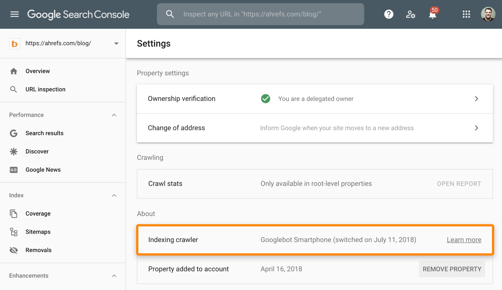 Prüfe zunächst, ob Google deine Website auf mobile Indexierung umgestellt hat. Das kannst du in der Google Search Console feststellen. Gehe einfach zu Einstellungen > Indexing Crawler.
