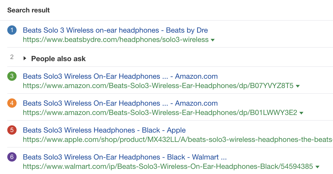 Ein Beispiel: Alle Ergebnisse für “beats solo 3” sind Produktseiten.