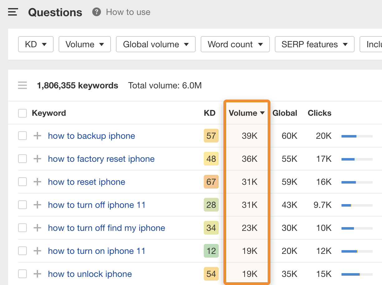 Um Fragen zu finden, die Personen stellen, prüfe den Report Questions (Bericht “Fragen”) im Ahrefs Keywords Explorer.