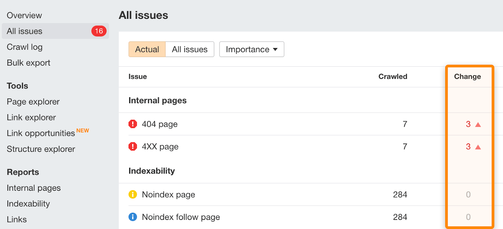 Normalerweise gibt es nicht viel zu tun, wenn deine Website responsive ist. Wenn du jedoch eine m‑dot oder komplexe Website hast, musst du sicherstellen, dass es keine wesentlichen Unterschiede zwischen deiner Desktop- und mobilen Website gibt. Dazu crawle deine Website mit einem Desktop-User-Agent über Site Audit in Ahrefs Webmaster Tools und wiederhole den Vorgang dann mit einem mobilen User-Agent. Die Unterschiede zwischen den beiden Crawls werden als “Änderungen” angezeigt.