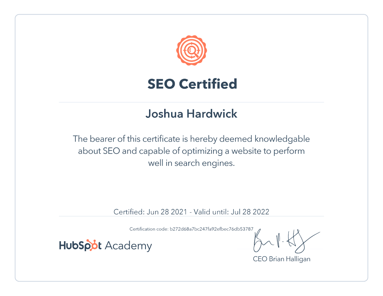 Wenn du dich fragst, warum ich andere beliebte Ressourcen (z.B.: Brian Deans “SEO That Works”), die häufig auf Listen von “SEO-Zertifizierungen” zu finden sind, nicht aufgeführt habe, liegt das daran, dass sie keine Zertifizierungen sind. Es sind Kurse. Es gibt weder eine Prüfung noch ein Zertifikat.