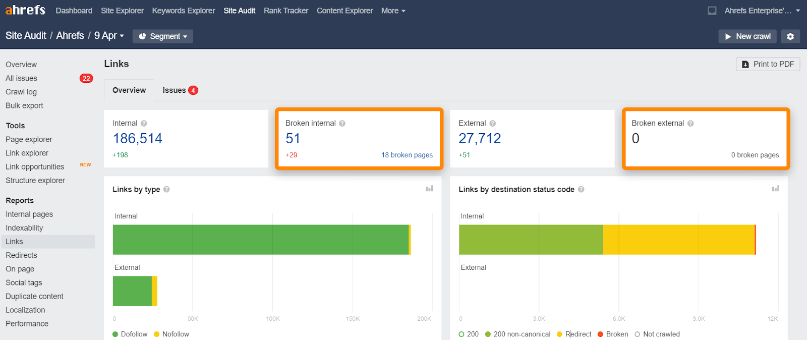 Du kannst defekte Links auf deiner Website schnell mit Site Audit im Links-Bericht finden. Dieses Tool ist in den Ahrefs Webmaster Tools kostenlos.