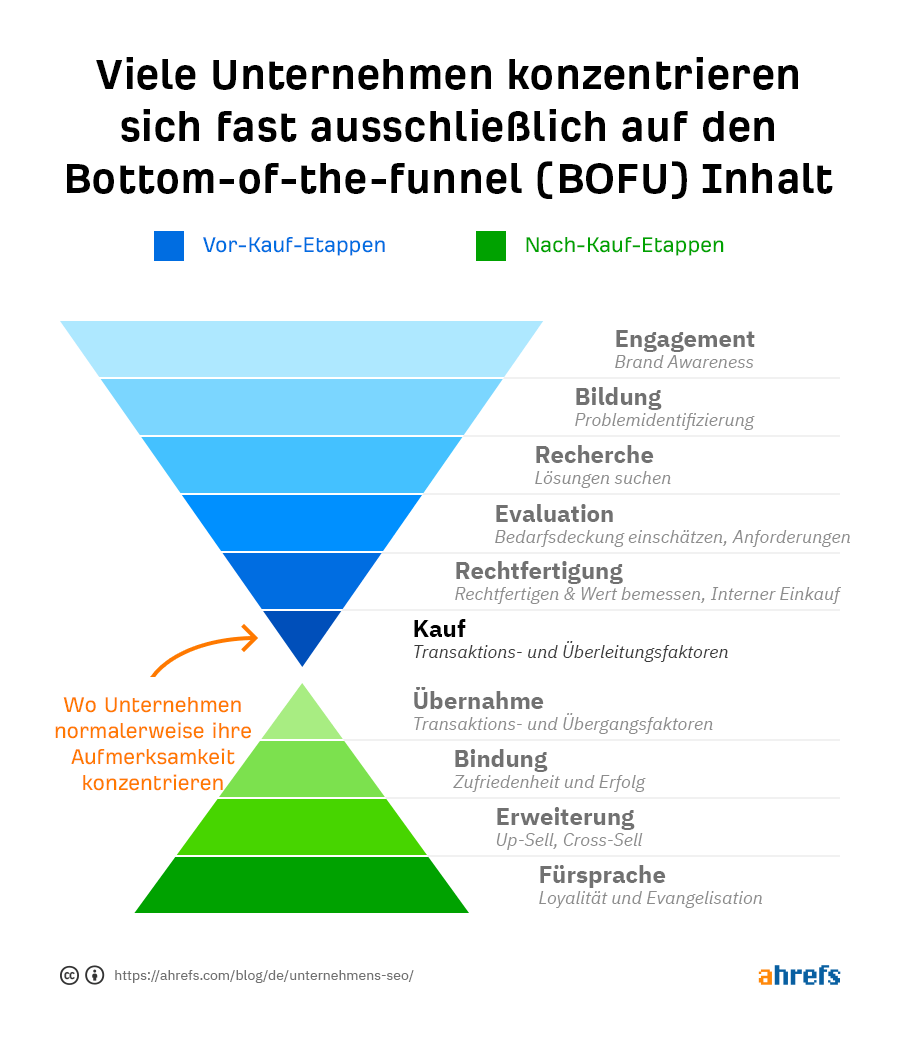 Verkäufe sind für die meisten Unternehmen lange Funnels. Trotzdem wollen viele Firmen die Top-of-the-Funnel und Informationsinhalte überspringen und sich mehr auf das Ende des Funnel-Verkehrs konzentrieren, der konvertiert. Dadurch verengen sie ihre Pipeline und geben ihren Konkurrenten die Möglichkeit, als Experten gesehen zu werden und statt ihnen selbst den Menschen zu helfen. Ebenso vernachlässigen viele Unternehmen die Nutzer nach dem Kauf. Dies führt zu verpassten Gelegenheiten im Fürsprecherbereich und auch im Upselling/Cross-Selling.