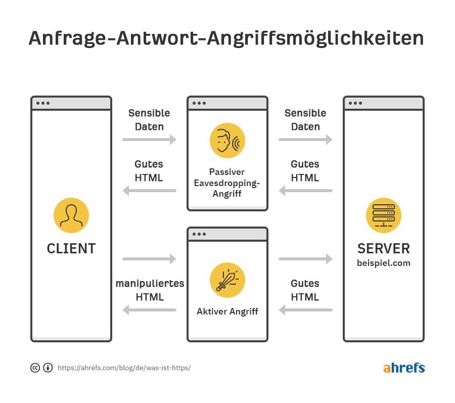 Zunächst möchte ich die Kommunikation zwischen Client (Browser) und Server vereinfachen und veranschaulichen, wenn sich ein Angreifer dazwischen befindet.